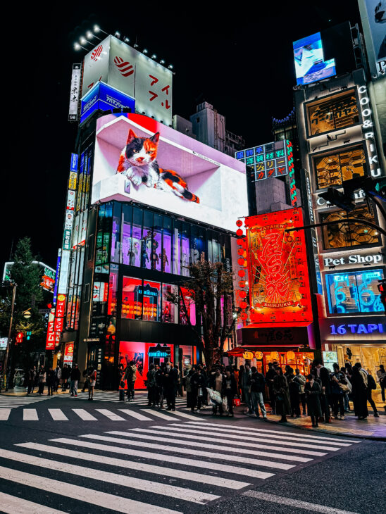 Cross Shinjuku Vision, crossing known for its 3D iconic animation—furry Calico Cat and his tricks.